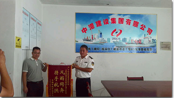 2016年8月12日下午13:00,巢湖市地方海事處通航科何科長、安全科王科長等一行三人到中港建設(shè)集團(tuán)有限公司-合裕線航道改造工程05標(biāo)項(xiàng)目部駐地頒發(fā)防汛救災(zāi)表彰錦旗。