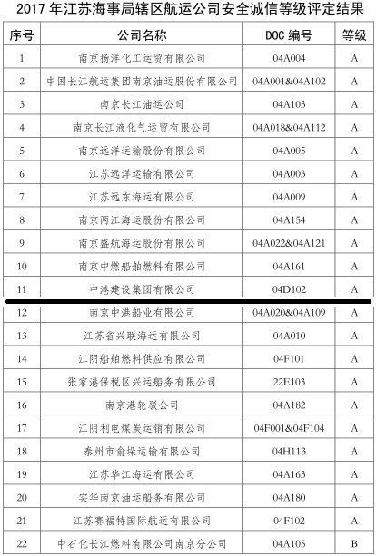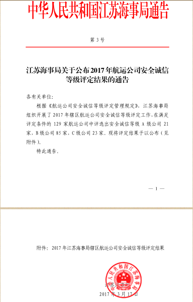 近日,在江蘇海事局組織開(kāi)展的2017年轄區(qū)航運(yùn)公司安全誠(chéng)信等級(jí)評(píng)定工作中,中港建設(shè)集團(tuán)在129家航運(yùn)公司中脫穎而出,被授予“江蘇海事局安全誠(chéng)信等級(jí)A級(jí)公司”榮譽(yù)稱號(hào),這是繼公司管理的船舶“華源交通1”號(hào)被評(píng)為“安全誠(chéng)信船舶”后獲得的又一殊榮,再次見(jiàn)證了中港建設(shè)集團(tuán)提高安全管理體系運(yùn)行質(zhì)量、踐行安全誠(chéng)信建設(shè)的能力和成績(jī),樹(shù)立了企業(yè)對(duì)社會(huì)負(fù)責(zé)的良好形象。