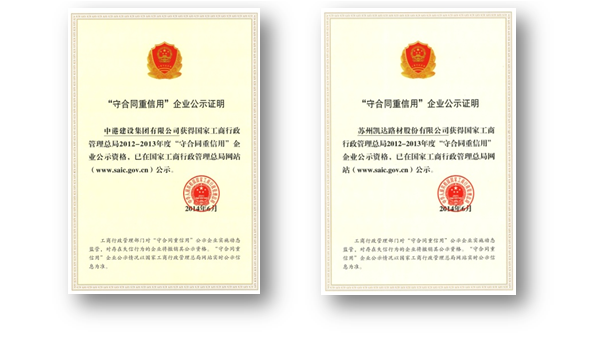 2014年6月,經(jīng)國(guó)家工商行政管理總局對(duì)全國(guó)所有在冊(cè)企業(yè)進(jìn)行考評(píng),中港建設(shè)集團(tuán)有限公司及下屬公司蘇州凱達(dá)路材股份有限公司雙雙被國(guó)家工商總局認(rèn)定為2012-2013年度“守合同重信用”企業(yè)稱(chēng)號(hào)。近期,中港建設(shè)集團(tuán)有限公司及下屬公司蘇州凱達(dá)路材股份有限公司收到國(guó)家工商行政管理總局“守合同重信用”企業(yè)榮譽(yù)證書(shū)。